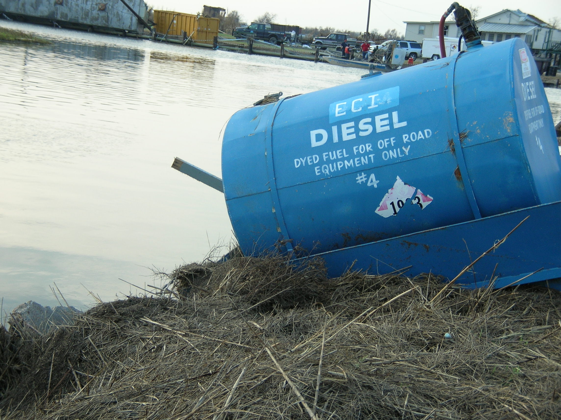Tank displaced by hurricanes Tank displaced on a dock in Plaquemines parish, Louisiana, after Hurricanes Katrina and Rita in 2005. Credit: NOAA
