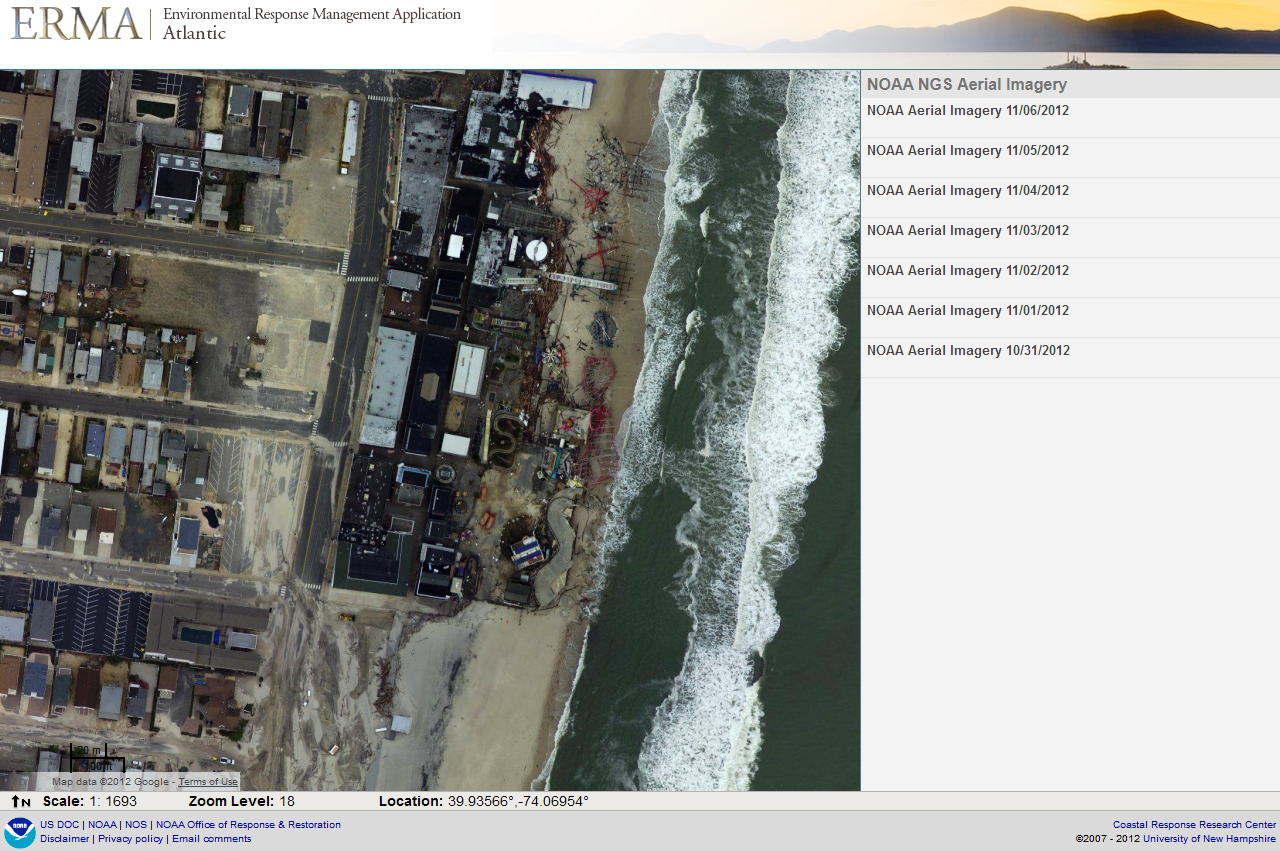 NOAA National Geodetic Survey aerial photography of the same section of Atlantic coast near Sandy Hook, N.J., after Sandy made landfall. Note the obvious the beach erosion and building damage.